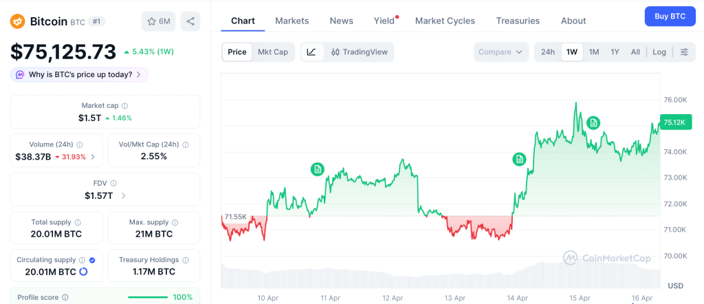 Bitcoin (BTC) trades near $75,125 after touching $75,900 on April 14 as Iran peace talks lifted risk assets per CoinMarketCap. Goldman Sachs filed for a Bitcoin Premium Income ETF on April 14, its first proprietary BTC product, days after Morgan Stanley launched the cheapest spot Bitcoin ETF at 0.14% expense ratio with $30.6 million in first-day inflows.