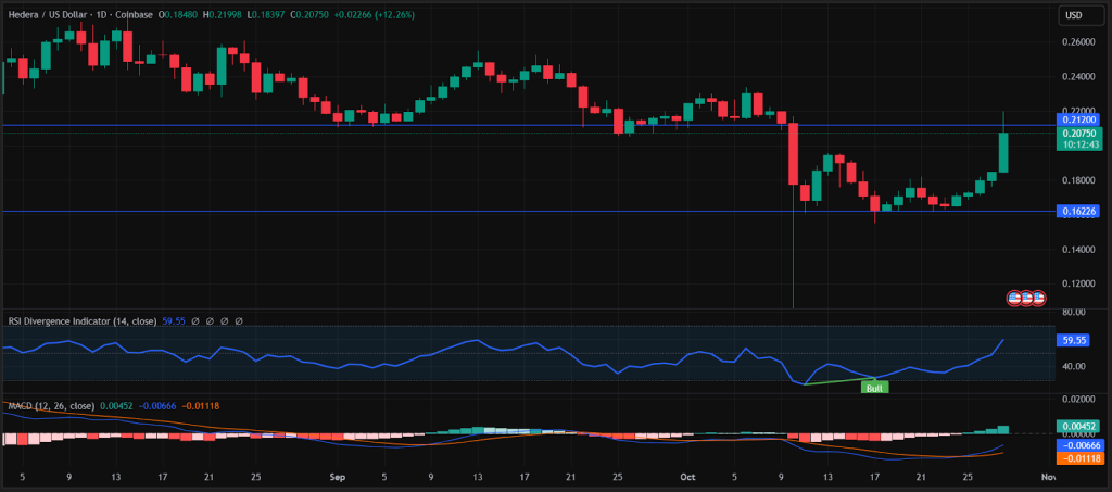 Currently, HBAR is trading at $0.20, just below the $0.212 resistance level. With buying pressure building up, Hedera could break above this level, potentially continuing to $0.30 with sustained upward momentum.