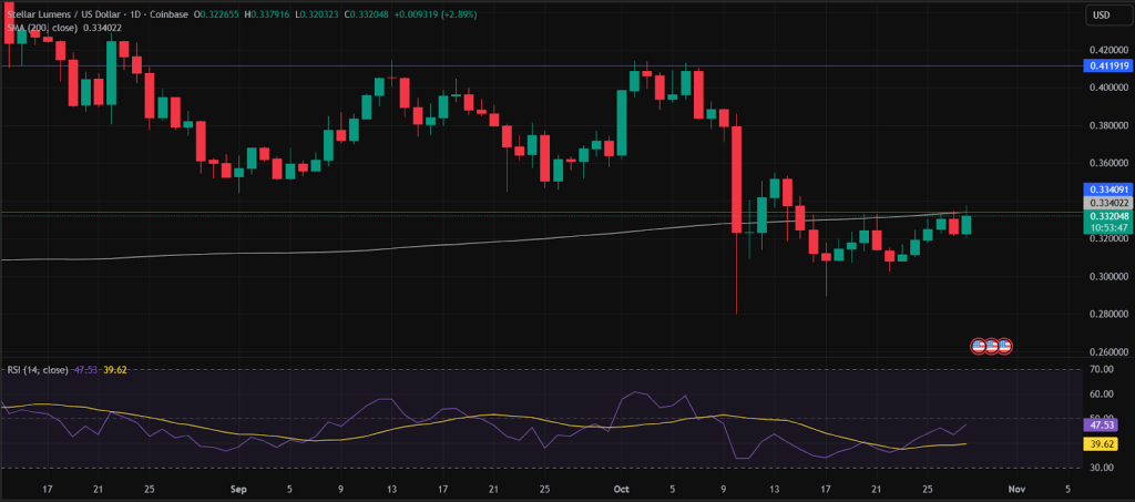 The RSI of 47 suggests Stellar has significant upside room. These technical indications suggest that a breakout from the immediate $0.334 resistance and the 200-day moving average could lead to a remarkable rally.