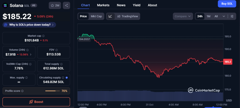 Solana (SOL) because of its rapid transaction rates and effective Layer-1 network. At the time of writing, SOL is trading around $185.22. Analysts are watching on the $180 support level, which might serve as a significant point to return. If SOL maintains this level and overall market sentiment improves, the token may move toward its upward trajectory and investors could see potential upside.