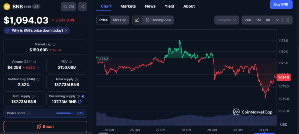BNB, the Binance ecosystem’s native utility coin, continues to be vital in trading, staking, and network activity on the BNB Chain. At the time of writing, it is trading at $1,094.03, showing a little 24-hour fall. But, analysts expect immediate support in the $1,060-$1,080 range, with resistance levels around $1,200.