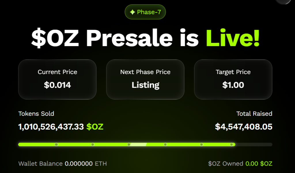 Currently, each $OZ token is priced at $0.014, and so far, $4.54 million in funds has been raised. With this strong investor involvement at this presale stage, the project’s projected target price is $1. If it reaches that, the current buyer could receive around 83x returns, and the early buyer could see 1000x returns.