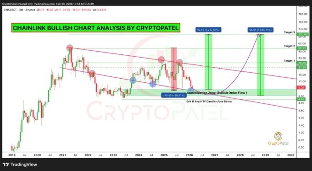 Crypto Patel shared on X that a detailed 3-week chart analysis outlining why he thinks LINK could be preparing for a major breakout. His long-term targets? $26, $52, and even $100.