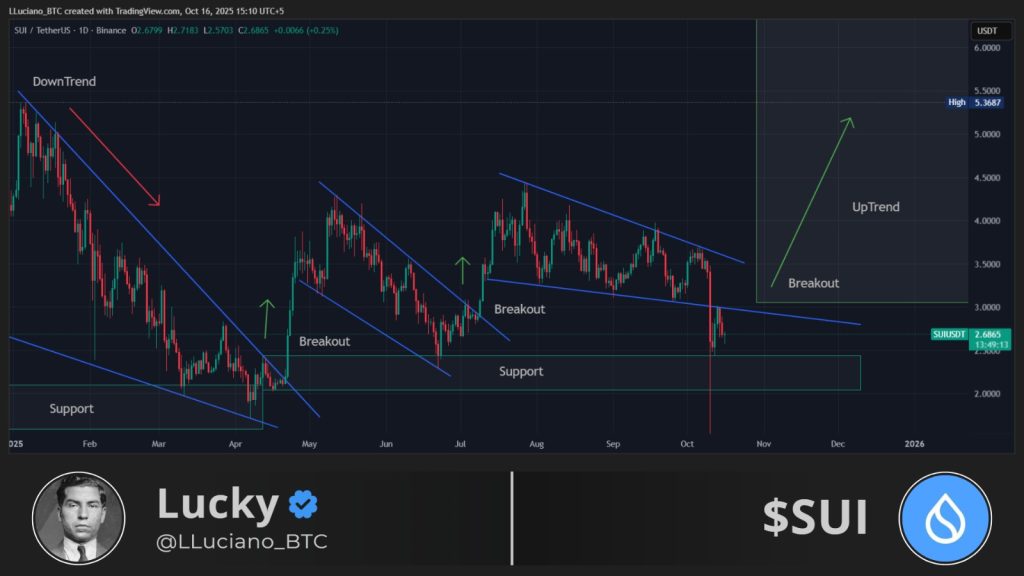 Zooming in on the daily chart, shared by LLucianoBTC, you can see SUI performing the same pattern again: downtrend → breakout → consolidation → breakout again. Each cycle has led to higher highs.