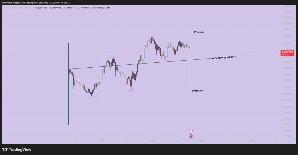 On the weekly chart, SUI is holding above a key ascending trendline that has acted as solid support multiple times. This line separates what traders call the discount zone (where prices are cheap) from the premium zone (where momentum kicks in).