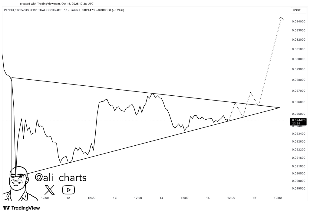 The triangle structure and technical readings tell a similar story: the market is coiled up and waiting. A confirmed close above $0.026 could unlock new buying energy, potentially carrying PENGU price toward the $0.035 area as Ali’s projection outlines. Failure to break through might keep price trapped in the pattern for a while longer.
