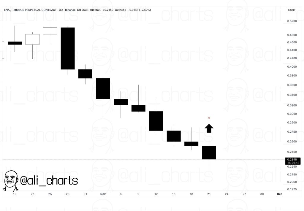 The ENA chart has been pretty dull for weeks, but that might be changing. That’s because analyst Ali Martinez spotted something interesting: a TD Sequential buy signal just popped up on the 3-day chart.