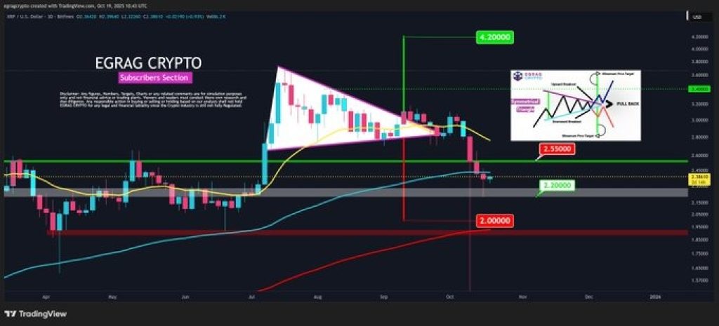 According to EGRAG, $2.20 remains the key line in the sand. Any close below that level on the 3-day chart would invalidate the bullish setup, but holding above it keeps the path open for a strong upside push.