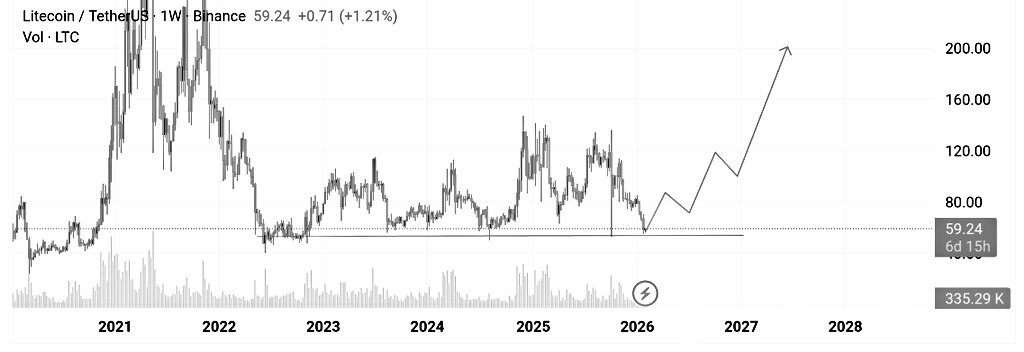 With Litecoin trading around $59, the price is right in that $55–$60 area that keeps showing up as a line buyers are willing to protect. This isn’t some new level that just formed last week. It’s a zone that’s been tested through multiple market phases, which is why it’s starting to matter again.