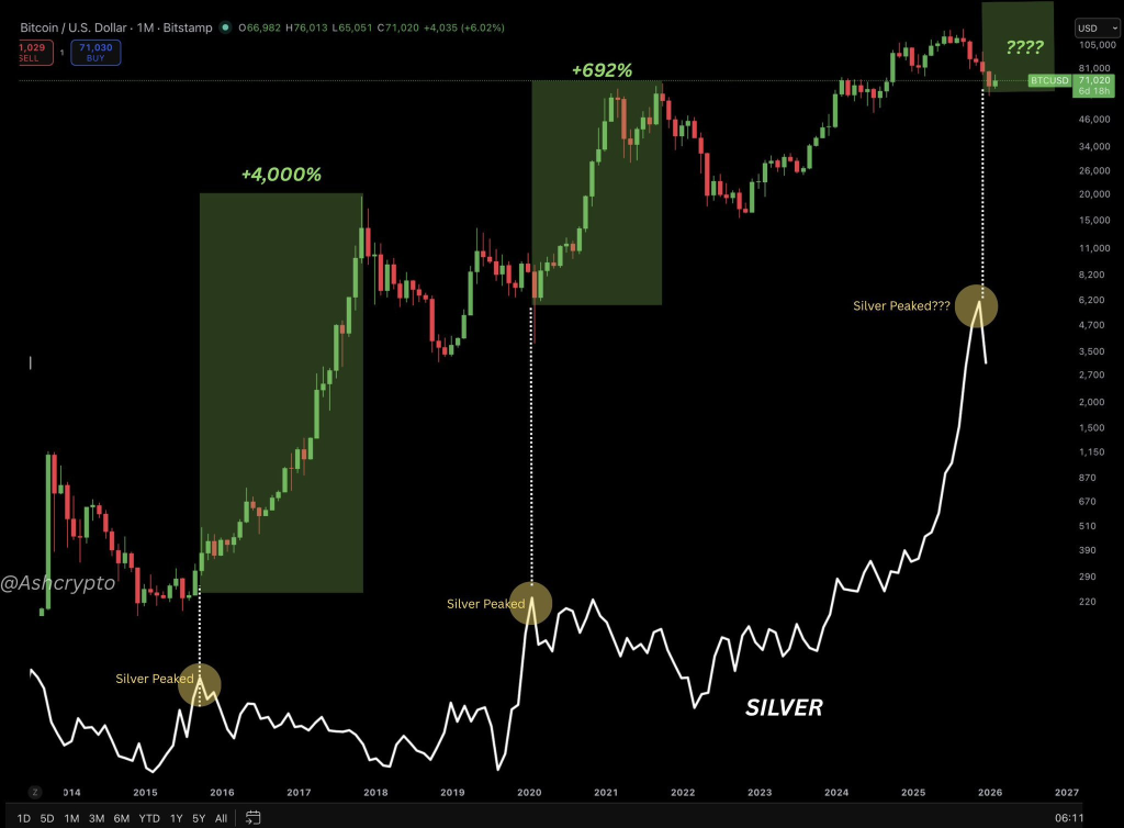 Silver’s sharp move above $120 followed by a fast pullback has started to draw attention across macro and crypto markets. That kind of price action often appears near cycle tops, and this time the reaction looks familiar when placed beside previous cycles. Bitcoin now trades around $71,000, and the question is whether this silver move could signal what comes next for BTC price.