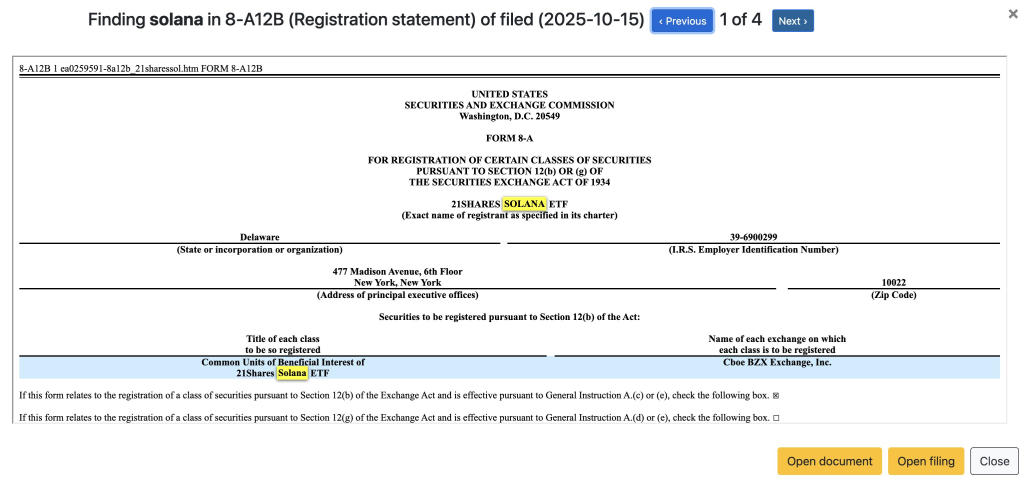 It’s finally happening – the 21Shares Solana ETF is officially on track to go live. A Form 8-A12B registration statement was filed with the U.S. Securities and Exchange Commission (SEC) on October 15, 2025, marking the final procedural step before trading can begin.