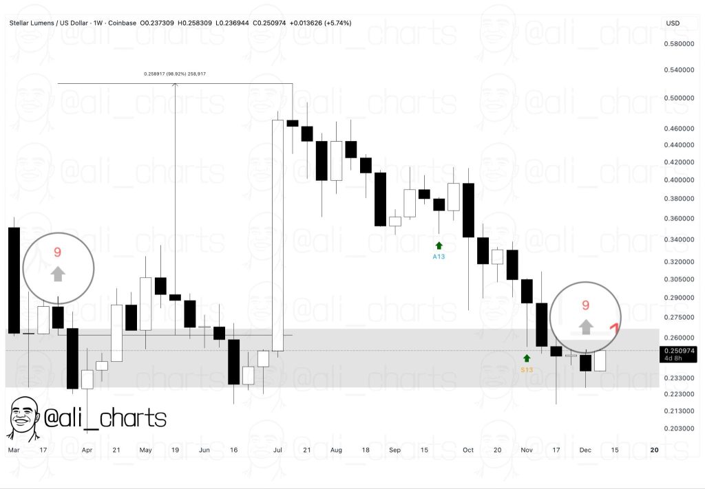 In Ali’s chart, the previous TD Sequential “9” printed when the XLM price had pulled back into the grey support band around the $0.23–$0.26 area.