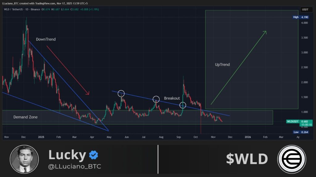 Lucky’s chart highlights something important: WLD already broke its long-term downtrend line earlier, but the broader market conditions weren’t strong enough to help the move stick.