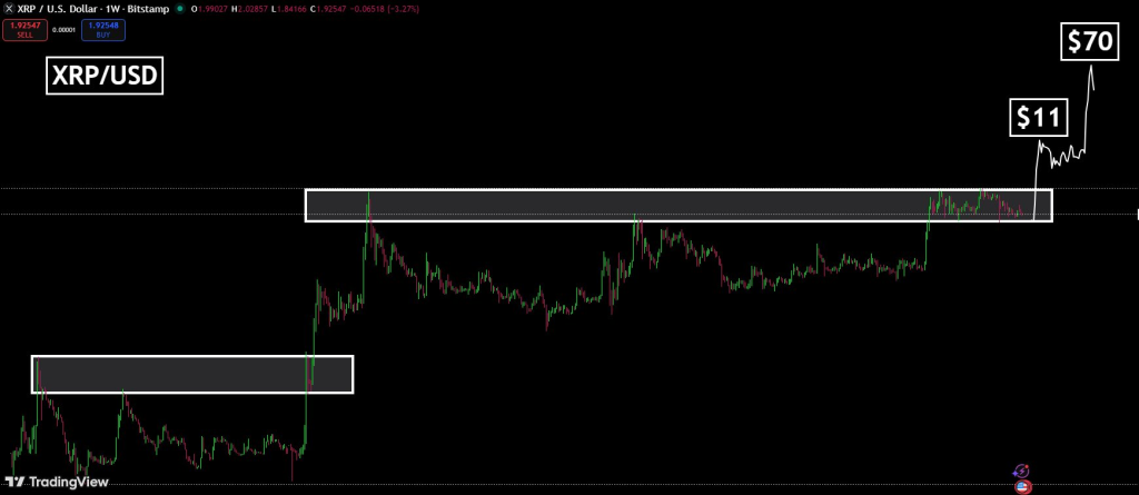 The logic here is not that XRP goes straight to $70 overnight. Instead, the chart indicates a two-stage move.