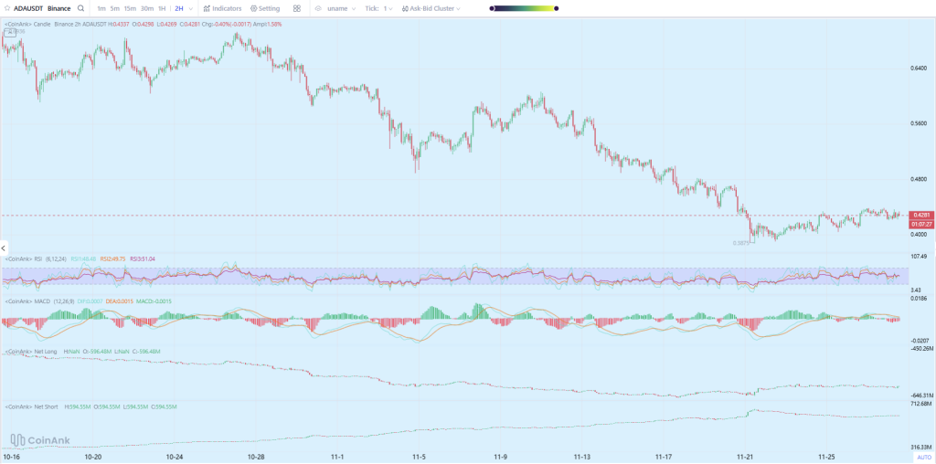 The 2-hour chart reveals a persistent downtrend stretching from mid-October to late November. The ADA price consistently printed lower highs and lower lows, falling from the $0.64 region into the $0.38–$0.43 zone. Every bounce was met with aggressive selling, and none of the rallies managed to reclaim the mid-trend structure.