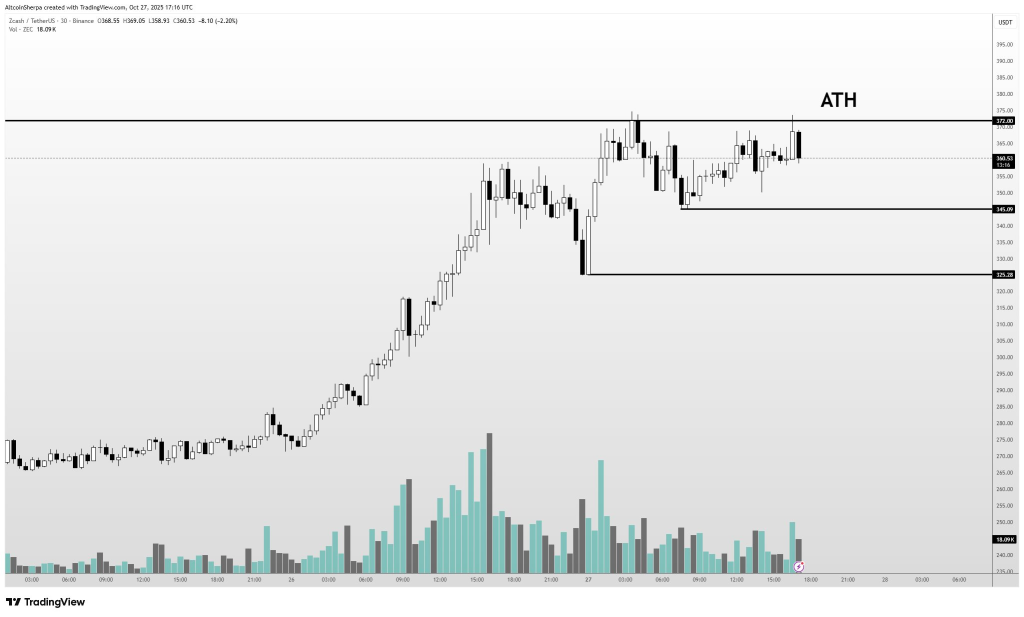 The chart shows ZEC trading between $345 and $375, with its all-time high resistance sitting just above that upper boundary. After a steep rally from around the $300 range, the ZEC price started to form a sideways pattern – holding strong but failing to make a clear breakout. Sherpa commented that it’s a question of individual risk tolerance, as traders have to decide whether to hold through a possible pullback or take profits while momentum slows.