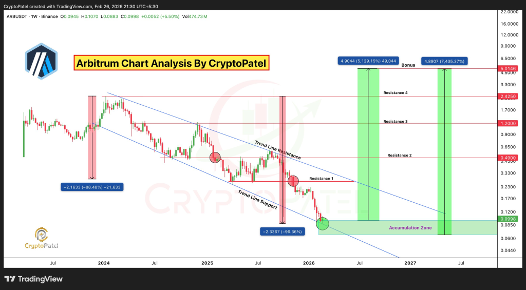 Crypto Patel laid out his case clearly. He pointed to the brutal reality first. ARB has dropped about 96% from its 2024 all time high of $2.42. That type of drawdown often discourages most market participants. Crypto Patel believes this is exactly where rare opportunities are found.