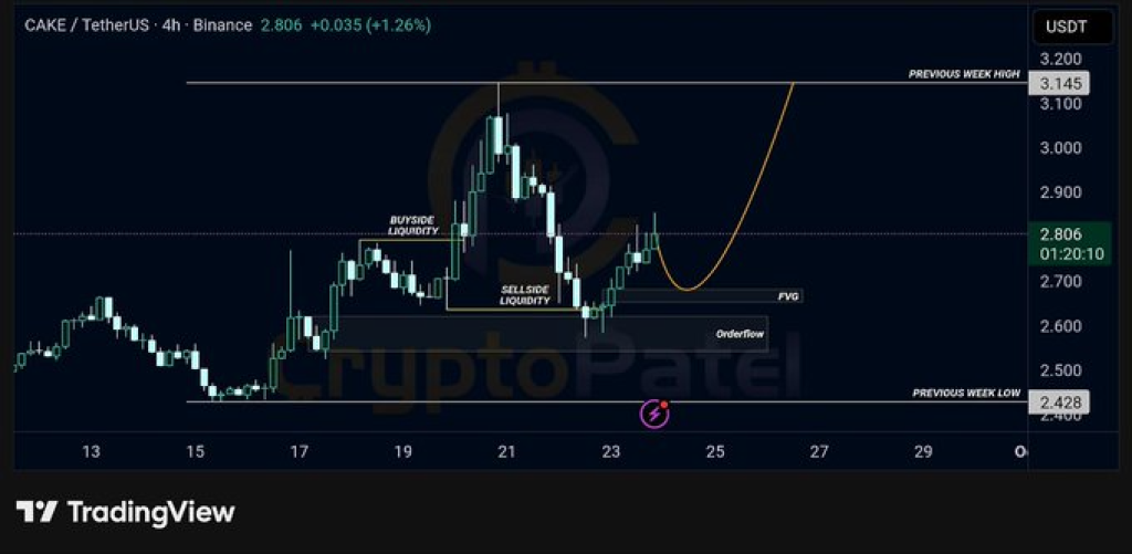 Here’s how he sees it happening. First, CAKE price could pull back toward $2.68, filling that fair value gap and shaking out any weak hands. If that bounce holds, price could then climb toward $3.145 and possibly higher.