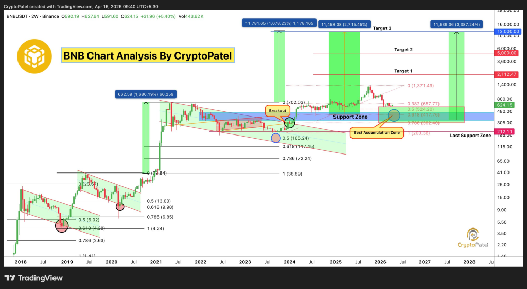 Binance Coin is back in focus after a long stretch of quiet consolidation, and the latest chart setup is starting to look familiar to those who have followed past cycles. BNB trades close to $620 at the time of writing, and price structure now sits near a zone that has historically acted as a turning point for major moves.