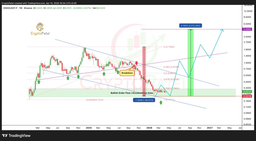 The potential upside scenario depends on a confirmed structure flip above resistance. If that happens, Crypto Patel outlines a path that starts with a move toward $1, followed by a retest of the $2.15 high. Further expansion could push the ONDO price beyond $5 if momentum returns in a stronger market phase.