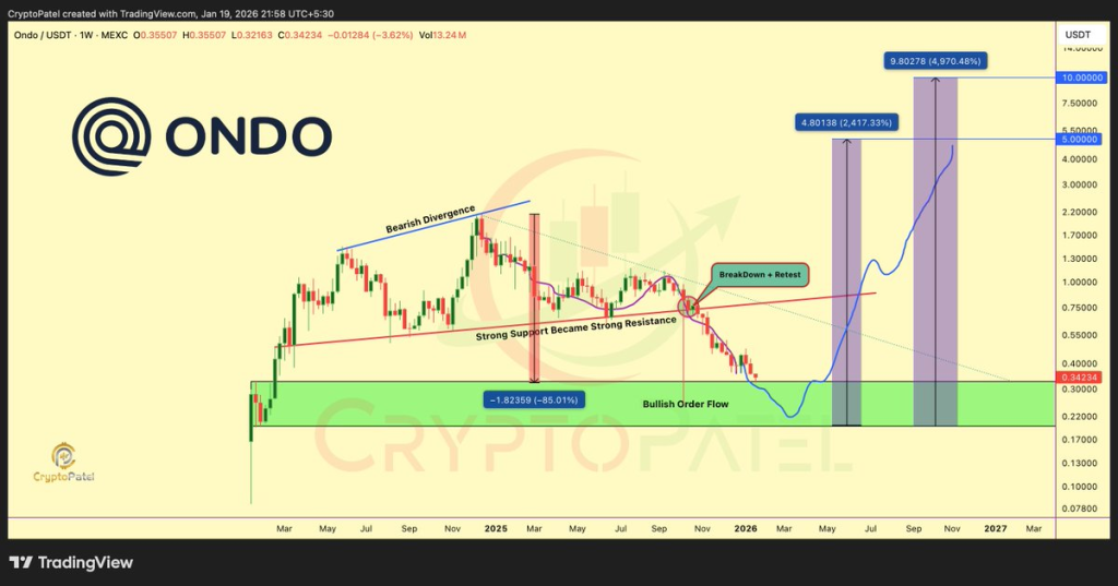 Crypto Patel highlights that ONDO price is sitting inside a high time frame demand zone between $0.30 and $0.20. This zone represents the same region where bullish order flow previously emerged before the last major expansion. The chart shows that former support around $0.73 to $0.80 failed and later acted as resistance, confirming a classic breakdown and retest structure rather than random weakness.