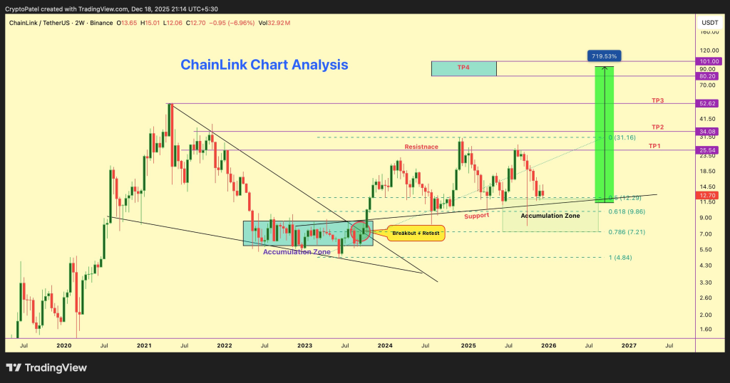 Chainlink price weakness has been persistent, yet structure still matters. Crypto Patel highlights that LINK is trading around the 0.5 Fibonacci retracement near $12.29. According to his analysis, that level often marks the beginning of accumulation zones during broader market resets.