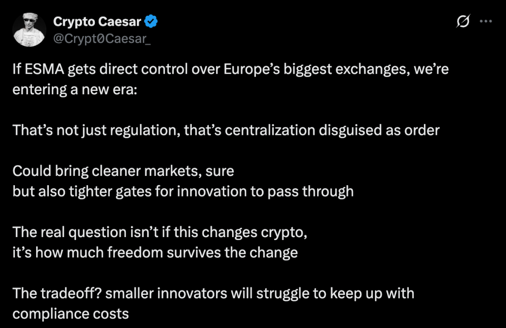 The European Commission is planning to give sweeping oversight powers to ESMA, centralising control over both traditional exchanges and crypto platforms. Supporters say it’ll fix MiCA’s regulatory gaps, but critics warn it could crush innovation inside the EU.