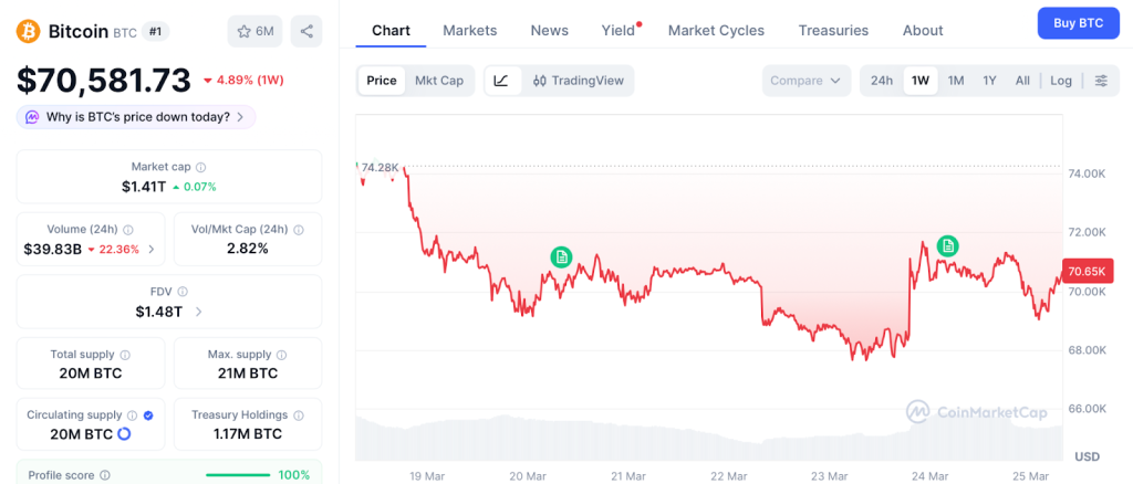 Bitcoin trades near $70,581 as of March 24 with Strategy holding 762,099 BTC and spot ETFs posting four straight weeks of inflows totaling $2 billion, according to CoinMarketCap.