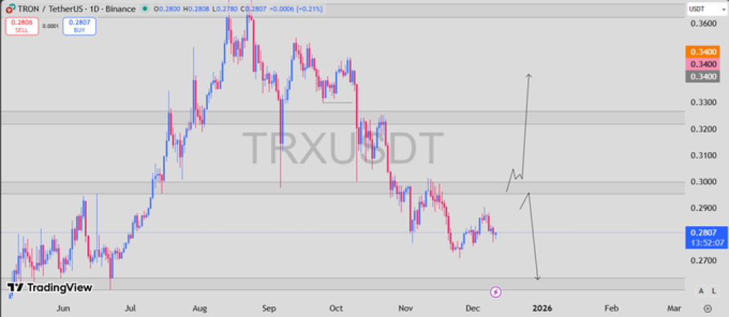 The downside remains just as important. If TRON fails to clear $0.30 and instead loses strength, sellers could take over and drag the price back toward $0.27.