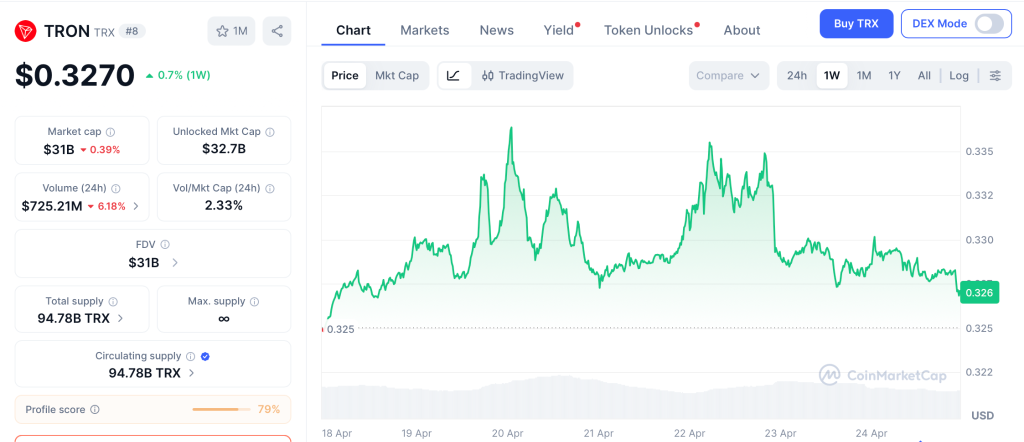 TRON (TRX) Price at $0.3270 as Q1 Revenue Crosses $826 Million