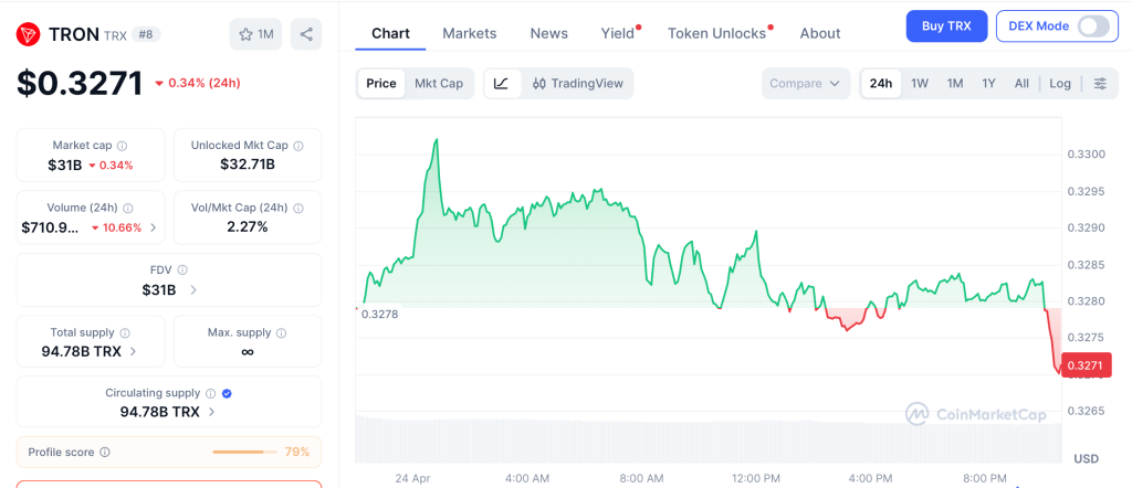 Tron (TRX) trades at $0.32 per CoinMarketCap, holding steady while most altcoins pulled back on April 23. TRX’s RSI hit 73 per CoinCodex, reaching overbought territory as the token tests $0.34 resistance.