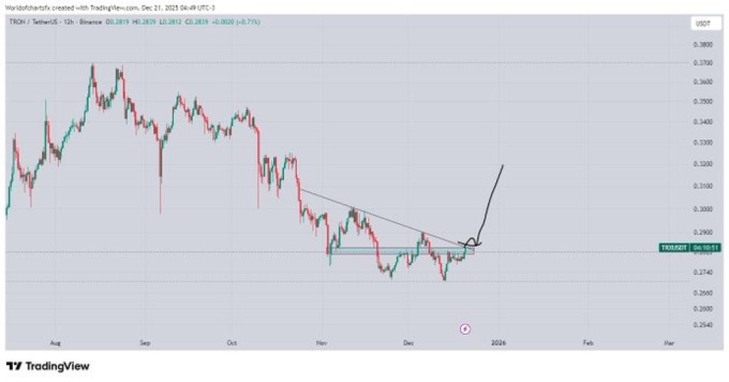 The TRX price is at a decision point. The next move away from this compression zone is likely to define direction in the near term, making this trendline test one of the most important technical moments for TRON in recent weeks.