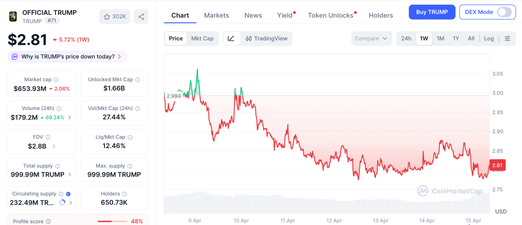 The trump coin price prediction keeps getting harder to trust when the token just dropped to its all-time low of $2.73 per CoinGecko despite whale wallets pulling millions from exchanges ahead of the April 25 Mar-a-Lago conference per BeInCrypto, and 77% of supply stays locked in insider wallets with daily unlocks running until 2028.
