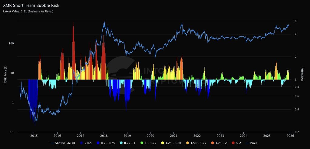 The bubble-risk chart from IntoTheCryptoverse gives an interesting perspective. Historically, whenever the XMR price entered the deep-red “bubble” zones, price peaked shortly afterward. Those spikes happened in 2017, 2021, and parts of 2022.