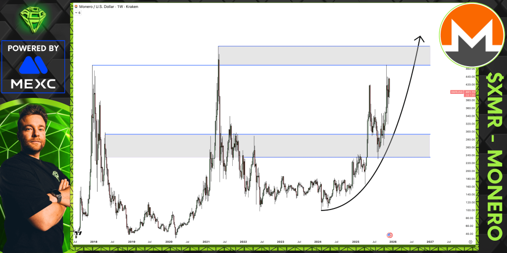 Higher highs, strong weekly candles, and no major breakdowns, exactly what long-term traders want to see. But even with all of that strength, the XMR price is bumping up against a major multi-year resistance zone in the $400–$450 range. This level rejected price brutally in past cycles, including 2018 and 2021.