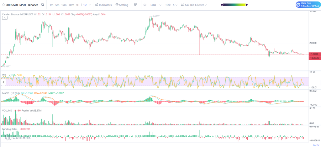 The indicators are not showing anything aggressive right now. The Williams %R is sitting around the middle, which simply means XRP isn’t overbought or oversold.