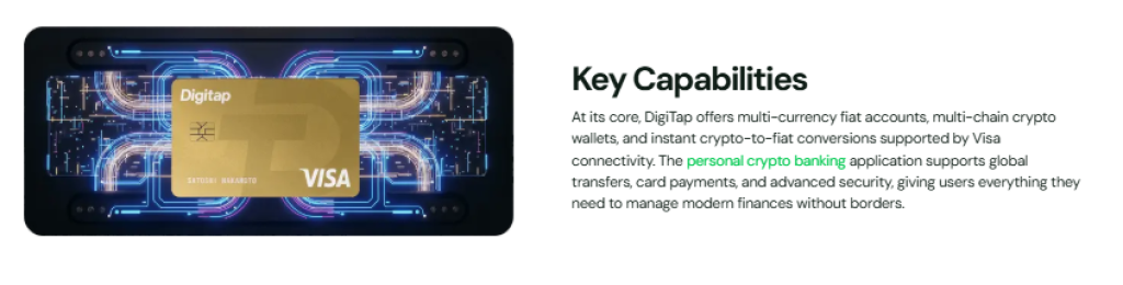 Digitap markets itself as the world’s first “omni-bank.” This means users can manage both fiat and crypto assets seamlessly through a single interface. Key features include more than 20 foreign currency bank accounts, high-yield savings accounts, crypto wallet support for more than 100 tokens, global money transfers, and a Visa debit card.