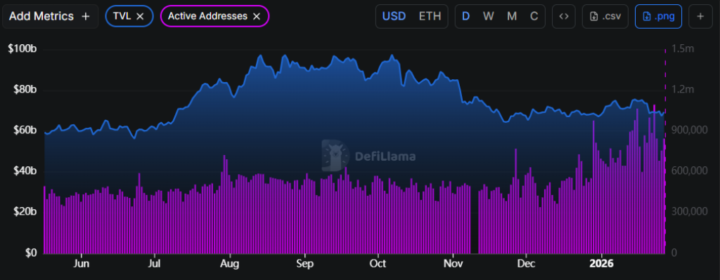 Still, Ethereum remains the dominant smart contract platform, and its market position is strong. Total value locked in decentralized finance has dipped from recent peaks but still stands near $60 billion, representing roughly 57% of all funds locked across blockchains. Active addresses also remain above recent averages.