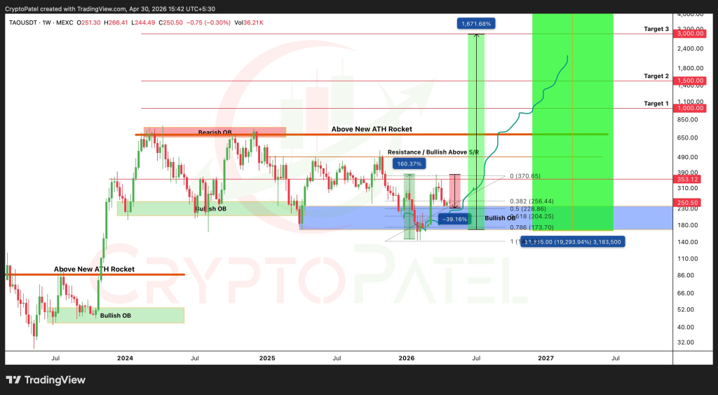 The chart also shows a much larger upside projection if TAO price recovers and breaks through major resistance. The first key upside target is near $1,000, followed by $1,500 and then $3,000.