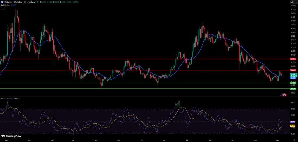 Chainlink has been consolidating between $11.50 and $15.00 as of early December 2025. The price has declined by more than 7% over the past month. Nonetheless, the community sentiment toward the altcoin remains strongly bullish. The RSI is around neutral territory on the daily timeframe, leaving room for upside without overbought risks.