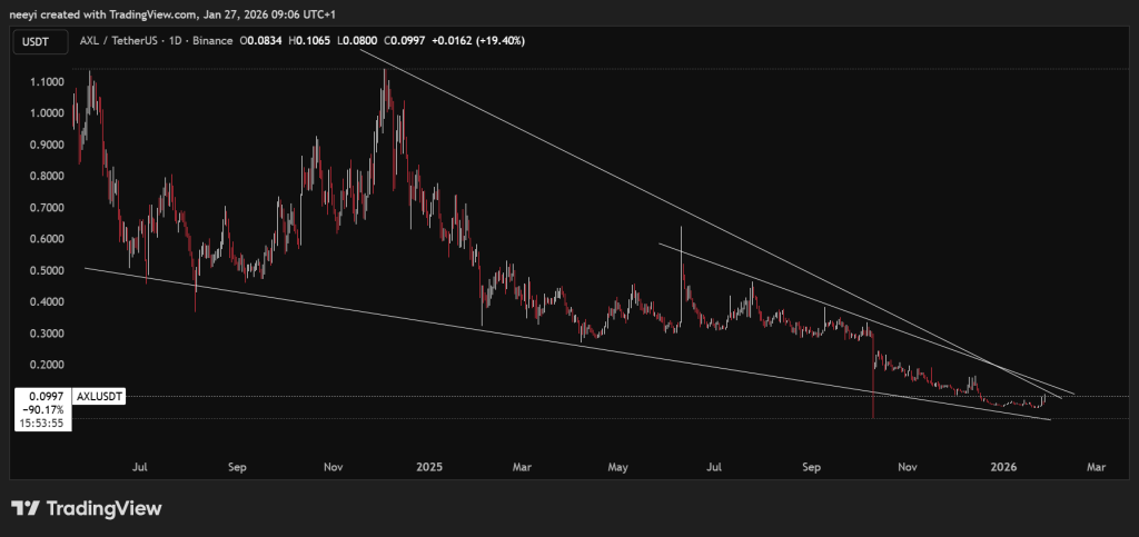 Despite the improving narrative, AXL price analysis shows that the entire rally remains inside the descending wedge visible on the daily chart. Both resistance and support lines continue to compress price action. The current move has carried AXL price close to wedge resistance, which has rejected price repeatedly in the past.