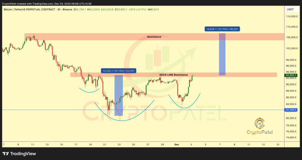 The chart shows 3 rounded dips, with the middle one being deeper. The neckline sits around the $92,000–$93,000 region, which BTC is currently testing. Patel noted that if BTC breaks above this neckline with conviction, the next major target lands near $105,000 to $107,000. These numbers come from measuring the height of the pattern from the head to the neckline and projecting it upward once the breakout confirms.