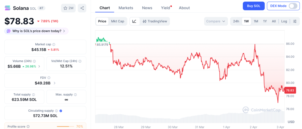 Solana trades near $78.83, down over 11% on the week after the $285 million Drift Protocol exploit shook the ecosystem, per CoinMarketCap.