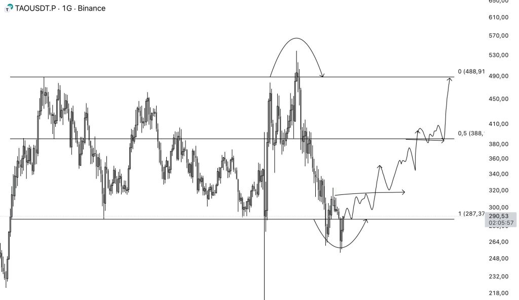 The second chart makes the picture even cleaner. TAO is forming a rounded bottom right at the $287 Fibonacci extension level.