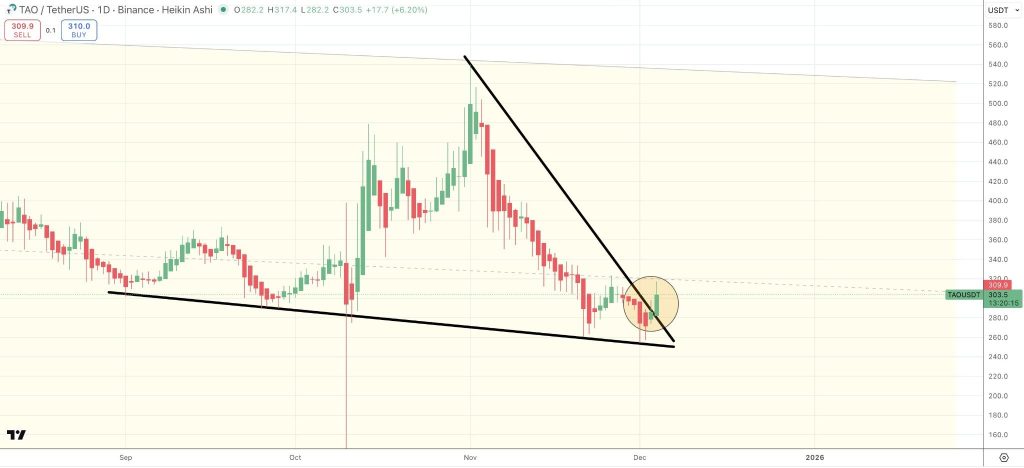 He shared the post just in time for the TAO price to rip through the $290–$300 zone and turn that level into a battleground for buyers. Whether by coincidence or crowd psychology, the market clearly reacted.