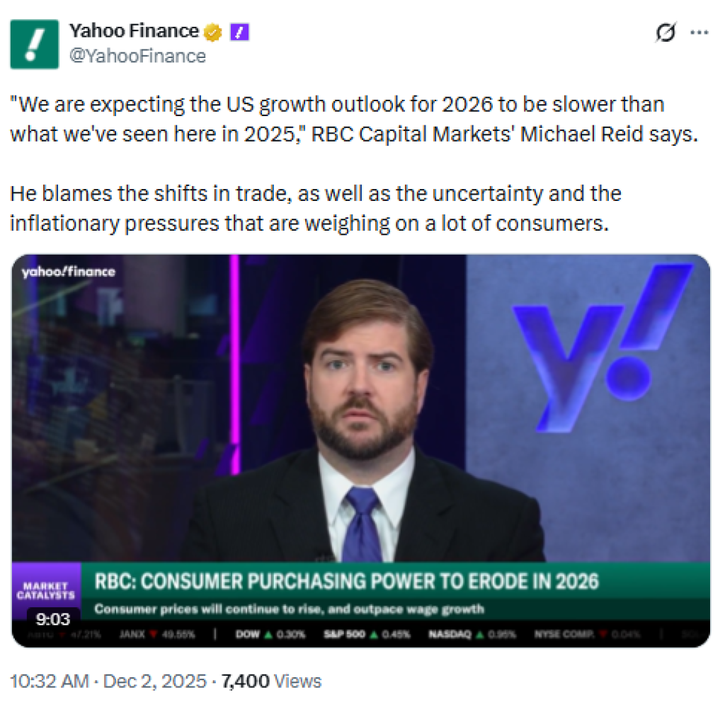 Concerns over the economic outlook are translating into worries about whether the global economy will slow in 2026 and whether corporate earnings and consumer demand will hold up. In this environment, the shift from “growth is fine” to “growth is at best fragile” is not a good indicator for the crypto market.
