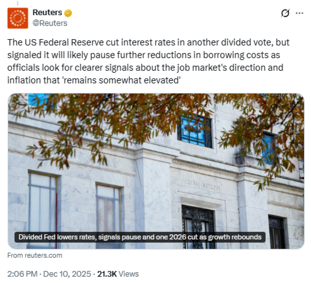 But the rally faded because the market interpreted the decision as more of a “controlled easing” than confirmation of a new wave of liquidity. The rate cuts were framed as cautious or conditional, meaning prevailing logic doesn’t necessarily apply.