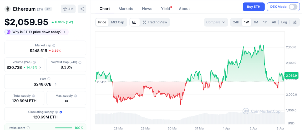 Ethereum trades near $2,059per CoinMarketCap. ETH is down over 60% from its 2025 high with analysts watching $1,900 support.