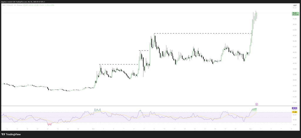 The DASH price has now reached $76+ with minimal consolidation, signaling a powerful continuation move from a long base.