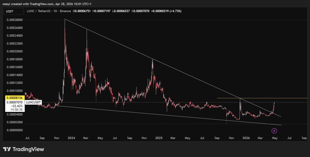 A look at the LUNC chart shows price has spent a long period moving inside a descending wedge since 2024. That pattern kept the broader outlook under pressure for months. Recent bullish action has pushed price toward the upper boundary, which gives a short-term positive tone even though the bigger structure still leans bearish.